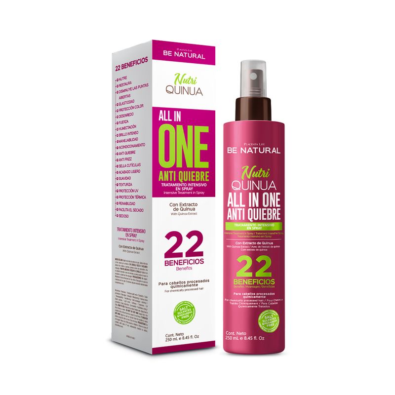 Descubre el poder de la simplicidad con nuestro producto capilar Nutri Quinua All in One Anti-quiebre. Una fórmula única diseñada para nutrir, fortalecer, reparar y proteger tu cabello, ¡todo en un solo paso! . 22 beneficios en 1. Termoprotección y Protección solar.