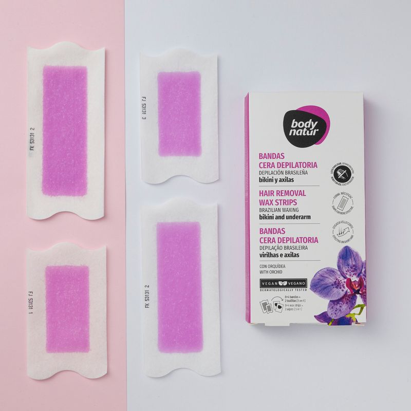 Body Natur Bandas depilatorias Bikini y axilas enriquecidas con Orquídea, proporcionan una depilación de larga duración hasta por 4 semanas mientras cuidan la piel sensible de la zona del bikini y las axilas. Consigue un acabado perfecto con las toallitas post depilatorias 5 en 1 que limpian, calman, hidratan, iluminan la piel y retardan el crecimiento del vello.