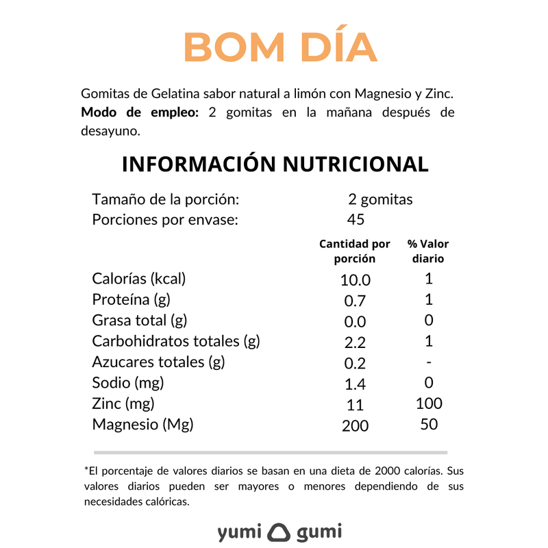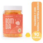 BOM DÍA son gomitas con Magnesio y Zinc con delicioso sabor a limón. Fomentan la producción de energía y proteína. Ayuda a fortalecer huesos y dientes. Brindan soporte al sistema inmune. Tomar 2 gomitas por las mañanas después del desayuno. 90 gomitas por pomo.