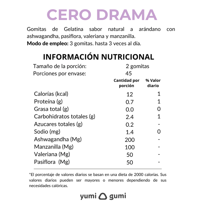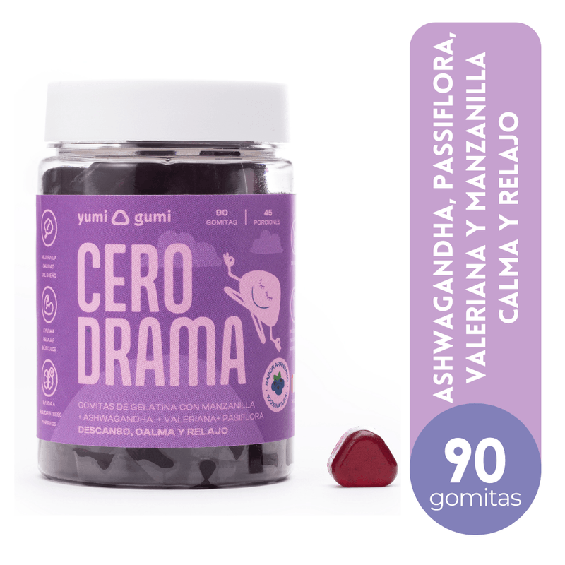 CERO DRAMA son deliciosas gomitas sabor a arándano con valeriana y manzanilla, sedantes naturales que ayudan a calmar, relajar y mejorar el sueño. Se recomienda 3 gomitas al día hasta 2 veces al día. Tomar en cualquier momento de estrés o 30 minutos antes de dormir. 90 gomitas por pomo.