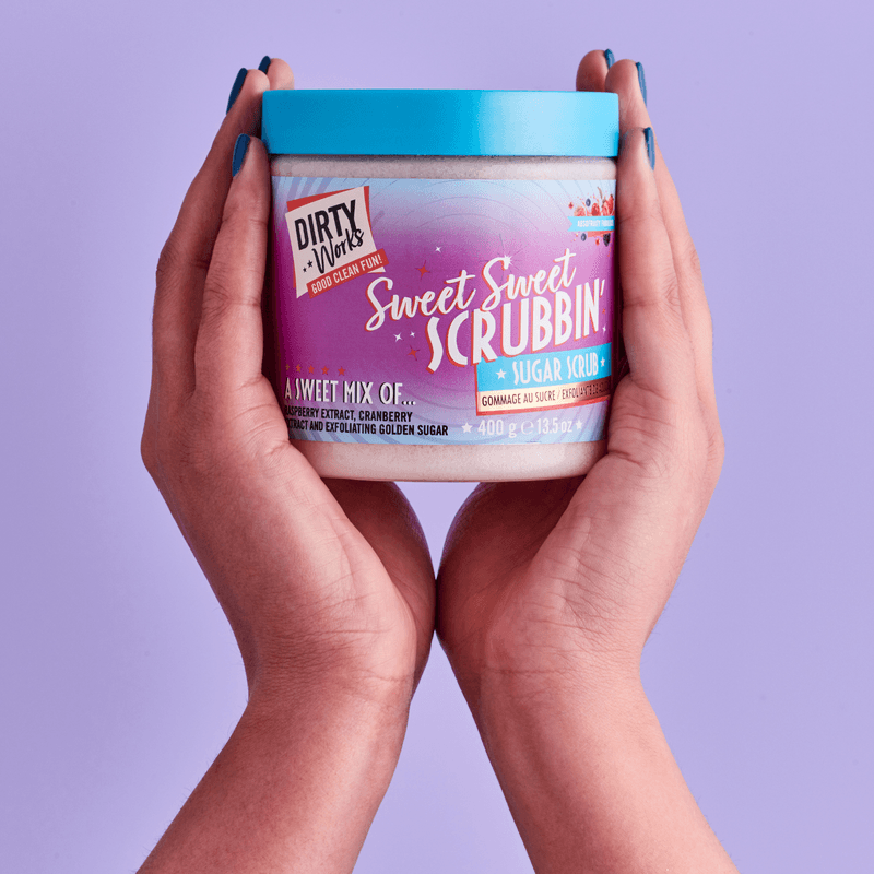 Un exfoliante dulce hecho con cristales de azúcar dorados exfoliantes y extracto de arándanos y frambuesa, para una piel suave y fresca que huele delicioso.