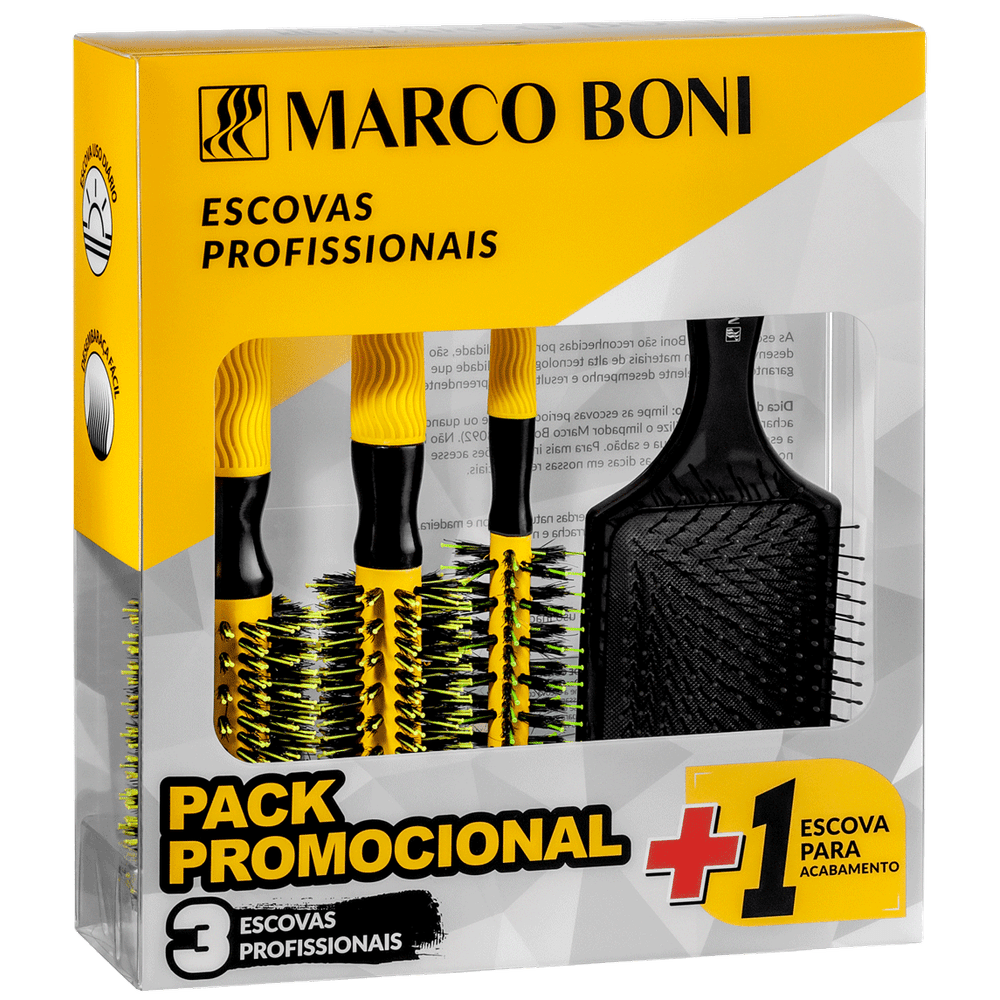 Kit de 3 Cepillos Profesionales y 1 Cepillo de Acabado Marco Boni.Cepillo Profesional con base de cerámica, acelera el secado del cabello al mantener la temperatura del secador.Con mango de goma, anatómico y en punta para facilitar la separación de mechones. Cerdas de doble altura, combinando nylon y cerdas naturales de jabalí, que ofrecen mayor tracción sobre el cabello. Se desliza con mayor facilidad. Seca, alisa, modela y da el toque final. Apto para todo tipo de tratamientos químicos.