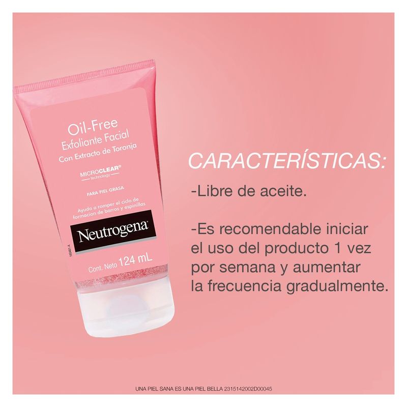 NEUTROGENA® Exfoliante Facial Oil Free con extracto de toronja elimina las manchas y puntos negros gracias a que contiene ácido salicílico al 2%, además de dejar una explosión refrescante de toronja en la piel. Con tecnología MicroClear y ácido salicílico de máxima potencia, actúan para eliminar el aceite que obstruye los poros, destapando los poros congestionados y eliminando la suciedad y las impurezas. Contiene extracto de toronja natural y vitamina C, además de delicadas micro perlas que suavizan las asperezas sin resecar ni irritar la piel.