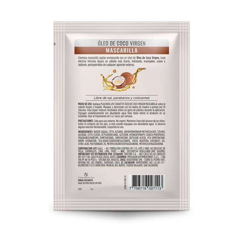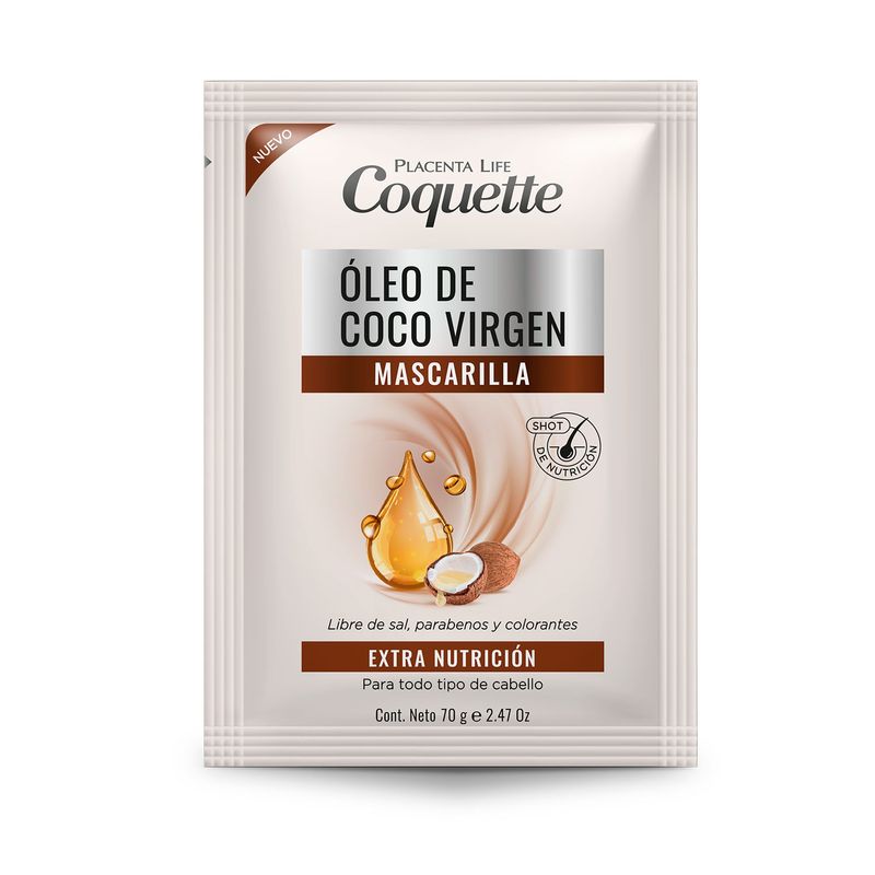 Mascarilla nutritiva enriquecido con Óleo de Coco virgen que actúa en cada hebra capilar proporcionando nutrición, suavidad y brillo al cabello.
