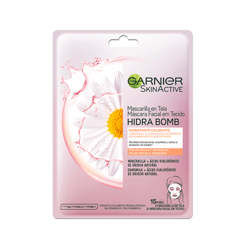 Mascarilla en tela Hidra Bomb de Garnier, enriquecida con Manzanilla para hidratar y refrescar la piel, logra un efecto calmante y sin sensación de tirantez en solo 15 minutos. Ideal para pieles Sensibles