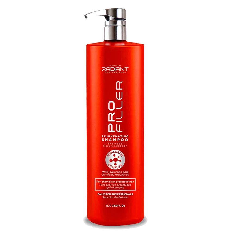 El Shampoo PRO FILLER de RADIANT es un producto profesional TECNOLÓGICO (con exclusiva tecnología de HYALURON COMPLEX), recomendado para cabellos con daño extremo (daño mixto, es decir una mezcla de procesos químicos en el cabello: tinturación y decoloración; alisado y tinte; etc.). Este Shampoo tiene un tecnología de rejuvenecimiento y tratamiento capilar intensivo, de relleno capilar asegurando resultados inmediatos y de alta efectividad que mejoran la apariencia del cabello expuesto a constantes daños.