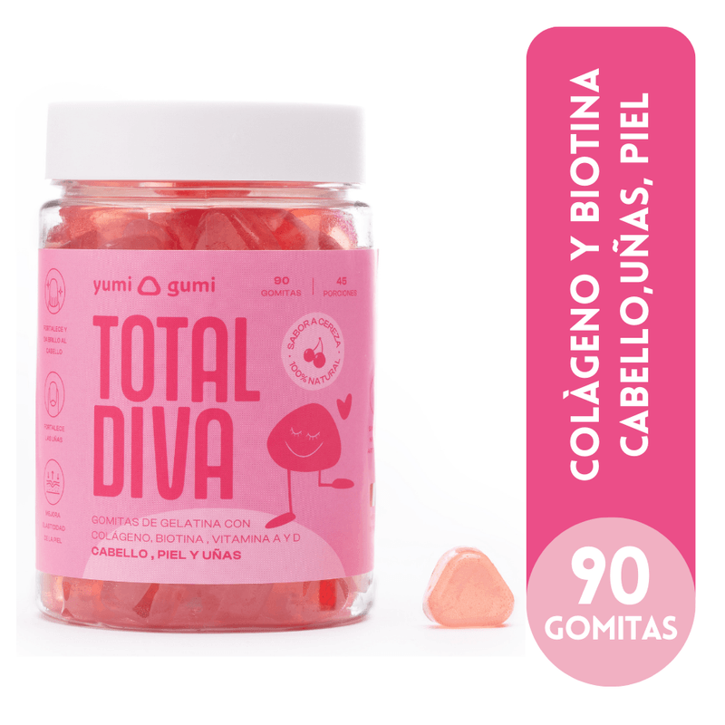 Las Total Diva son deliciosas gomitas sabor cereza con colágeno, biotina y vitamina A y D lo que las hace un complemento ideal para mantener una piel, cabello y uñas sanos y fuertes. Ayudan a que el cabello y las uñas no se partan y crezcan más sanas y fuertes. Ayudan a mejorar la elasticidad de la piel. La dosis diaria es de 2 -3 gomitas hasta 2 veces al día. 90 gomitas por pomo.
